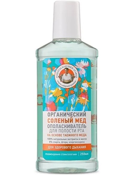 ОПОЛАСКИВАТЕЛЬ ДЛЯ ПОЛОСТИ РТА ОРГАНИЧЕКИЙ СОЛЕНЫЙ МЕД ДЛЯ ЗДОРОВОГО ДЫХАНИЯ НА ОСНОВЕ ТАЕЖНОГО МЕДА освежает дыхание, очищает труднодоступные места, лечит мелкие повреждения и нормализует микрофлору полости рта.
