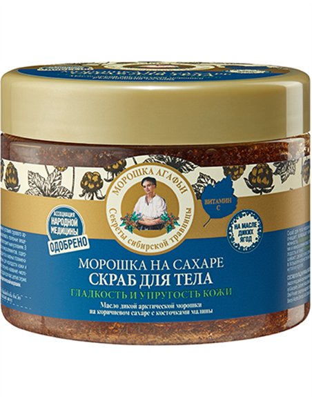 Скраб для тела «морошка на сахаре» на основе масла диких ягод бережно очищает, возвращает коже упругость и эластичность, придает гладкость и нежность. Масло дикой арктической морошки, обогащенное антиоксидантами и микроэлементами, стимулирует обновление клеток, придавая коже молодость и тонус. Косточки малины и коричневый сахар эффективно отшелушивают, делают кожу ровной и гладкой. Сок сибирского барбариса содержит в большом количестве витамин С и А.Н.А.-кислоты, делает кожу более подтянутой и упругой.