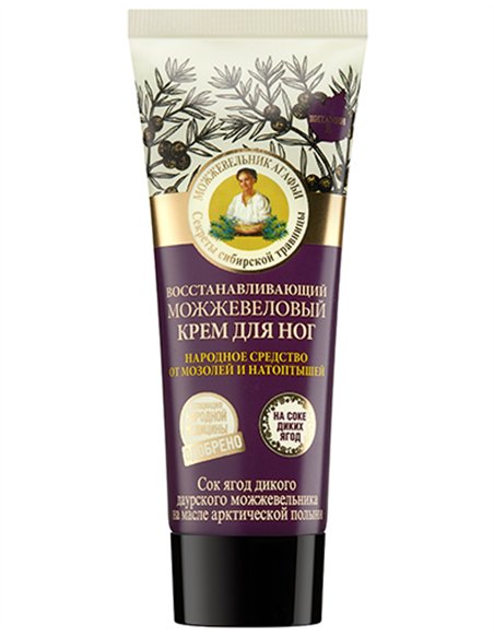 Восстанавливающий можжевеловый крем для ног помогает избавить стопы от мозолей и натоптышей, делая кожу ног мягкой и нежной. Сок ягод дикого даурского можжевельника оказывает противовоспалительное и антисептическое действия, глубоко питает и восстанавливает кожу стоп. Масло арктической полыни эффективно размягчает мозоли и натоптыши. Органический экстракт тысячелистника интенсивно увлажняет и успокаивает кожу, предотвращая сухость стоп, обладает мощным заживляющим действием.