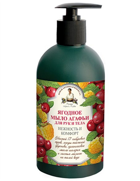 Ягодное мыло Агафьи, сваренное на талой воде, с добавлением ягод спелой таёжной брусники, натурального масла шалфея и листьев малины прекрасно очищает кожу рук и тела, мягко и бережно ухаживая за ней. Ягоды брусники сибирской и масло шалфея - уникальные дары природы, с самых давних времён ценились своими полезными свойствами. Входящие в состав мыла органические компоненты и целебный настой из 17 сибирских трав, собранных в экологически чистых районах Алтайского края, перенесут Вас в особый таёжный мир, окутают ароматом диких трав и спелых ягод, обеспечат питание и уход Вашей коже. Ощутите благотворное действие старинных целебных рецептов вместе с Ягодным мылом Агафьи!