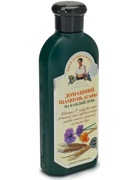 Домашний шампунь Агафьи на каждый день создан на настое 17 сибирских трав, шишек хмеля, луковой шелухи, ржаного хлеба и прополиса на талой воде. Шампунь на основе талой воды в сочетании с проверенными домашними средствами для дополнительного "питания" волос обеспечивает очень мягкую, но эффективную основу для мытья, подходящую для частого применения.