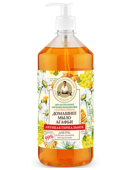 Горчично-ромашковое мыло Агафьи - это новый продукт в линейке уже полюбившегося домашнего мыла, теперь с доказанными антибактериальными свойствами. Домашнее мыло прекрасно подходит для мытья рук и посуды, справляется с уборкой на кухне и убивает 99% бактерий. Мыльный корень - натуральная пенящаяся основа, богатая сапонинами, эффективно очищающая, но при этом абсолютно безопасная и гораздо мягче щелочи, используемой в обычном мыле. Горчичный порошок содержит аллиловое масло - отличный растворитель жиров и загрязнений любой природы, очищает посуду до блеска и скрипа даже в холодной воде. Экстракты ромашки и календулы обладают прекрасными антисептическими и бактерицидными свойствами, придают посуде свежесть. Отвары таволги и череды содержат полезные микроэлементы, которые глубоко увлажняют нежную кожу рук.