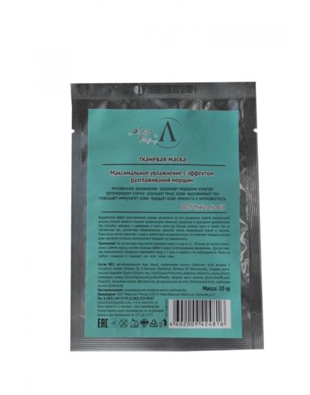 Выраженный эффект разглаживания морщин достигается за счёт уникальных свойств гиалуроновой кислоты, которая является мощным катализатором обменных процессов и природным увлажнителем. Она способна связывать и удерживать в шесть тысяч раз больше молекул воды в тканях, чем её собственный вес, препятствуя обезвоживанию, наполняя клетки живительной влагой и сиянием. Ткань маски плотно прилегает к коже и препятствует испарению жидкости, что позволяет передать клеткам кожи максимум полезных компонентов и повышает их усваиваемость.