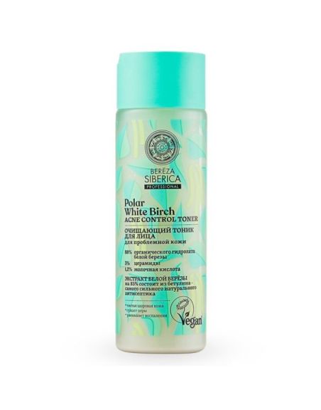 Очищающий тоник для лица очищает и сужает поры, успокаивает, делая кожу чистой и здоровой, готовит ее к последующему нанесению средств ухода. Белая полярная береза содержит в несколько раз больше бетулина, чем береза, растущая в средних широтах. А высокие концентрации витаминов B2 и B5 оказывают сильное успокаивающее действие, препятствуют потере влаги, осветляют несовершенства и выравнивают тон кожи. БЕТУЛИН известен своим мощным противовоспалительным действием, он эффективно успокаивает раздражения, сужает расширенные поры, препятствует возникновению акне и усиливает иммунные свойства кожи, одновременно увлажняя и поддерживая здоровый баланс. Церамиды – поддерживают оптимальный гидролипидный баланс в коже, защищают от потери влаги, мягко стимулируют процессы восстановления.Молочная кислота – очищает поры и препятствует образованию черных точек, осветляет следы постакне, выравнивая тон кожи.