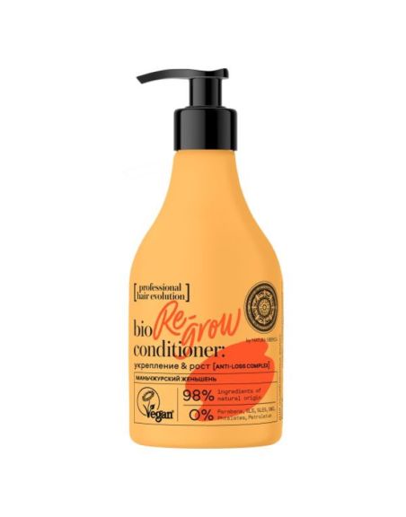 Бальзам для волос "RE-GROW.Укрепление & рост волос" укрепляет и тонизирует кожу головы, доставляет питательные вещества волосяным фолликулам, продлевая и стимулируя фазу роста, создает невидимую защиту от корней до кончиков, предотвращая повреждения и ломкость. Корень маньчжурского женьшеня: укрепит корни и сократит выпадение, разбудит неактивные фолликулы Кофеин: стимулирует работу волосяных луковиц Биотин: заметно ускорит рост волос при регулярном применении