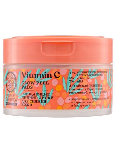 ОЧИЩАЮЩИЕ ПИЛИНГ-ДИСКИ ДЛЯ СИЯНИЯ КОЖИ мгновенно преображают, создавая эффект безупречно гладкой и светящейся изнутри кожи! Нежно очищают, восстанавливая естественный pH кожи, обладают легким пилинг-эффектом, выравнивая тон и текстуру, освежая цвет лица. Органический гидролат алтайской облепихи благодаря высокому содержанию витамина С, ускоряет процессы восстановления, способствует удержанию влаги в коже, возвращая ей упругость и эластичность. Активная форма витамина С «Active C+» подходит даже для чувствительной кожи, отлично воздействуя на верхние слои, защищая от УФ-излучения. АHA-кислоты нормализуют pH кожи и работу сальных желез, отлично отшелушивают, помогают уменьшить гиперпигментацию, улучшая цвет лица.