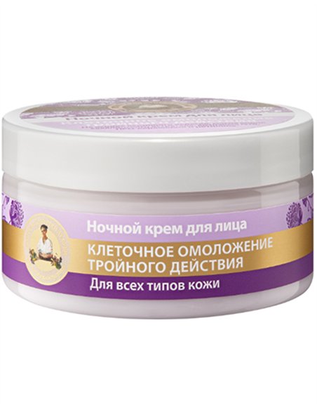 Ночной крем для лица тройного действия созданный по рецептам сибирской травницы Агафьи, эффективно действует на клеточном уровне и восстанавливает кожу во время сна, обеспечивая ее активное питание и регенерацию. Кедровой вереск содержит большое количество органических кислот и дубильных веществ, благодаря чему он прекрасно тонизирует и освежает кожу. Масло корня сахалинского астрагала богато эфирными маслами, флавоноидами и органическими кислотами. Оно успокаивает и смягчает кожу, освобождает ее от накопленного за день напряжения. Коэнзим Q10+ восстанавливает и омолаживает кожу во время сна, придает ей упругость и эластичность. ПРО-керамиды и ретинол глубоко питают и разглаживают кожу, сокращая глубокие и мелкие морщины