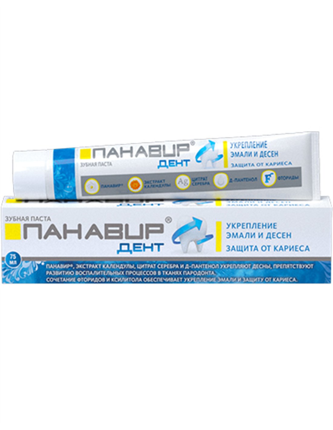 Комплекс активных компонентов зубной пасты «ПАНАВИР® дент» обеспечивает антимикробное, противовоспалительное, местное противовирусное и заживляющее действие, помогает сохранить здоровье зубов и десен.