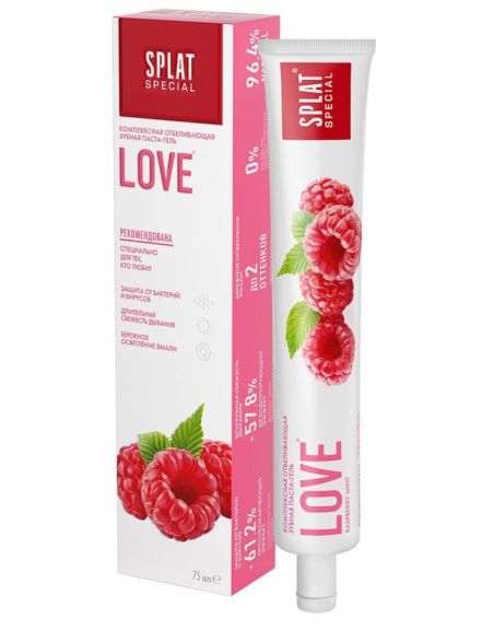 Благодаря компоненту из экстракта лакричного дерева, который является мощным антисептиком, зубная паста LOVE эффективно защищает от вируса простого герпеса. Компания SPLAT совместно с НОЦ ""Экология человека"" экологического факультета Российского Университета Дружбы Народов провела специальное исследование, в результате которого в 80% случаев было выявлено положительное влияние зубной пасты LOVE на эмоциональное состояние человека. На основании данного исследования можно предположить, что LOVE от SPLAT увеличивает уровень эндорфина - гормона счастья – в крови. Нежная ярко-красная паста LOVE создана, чтобы доставлять удовольствие! Яркий малиновый аромат. Без фтора.