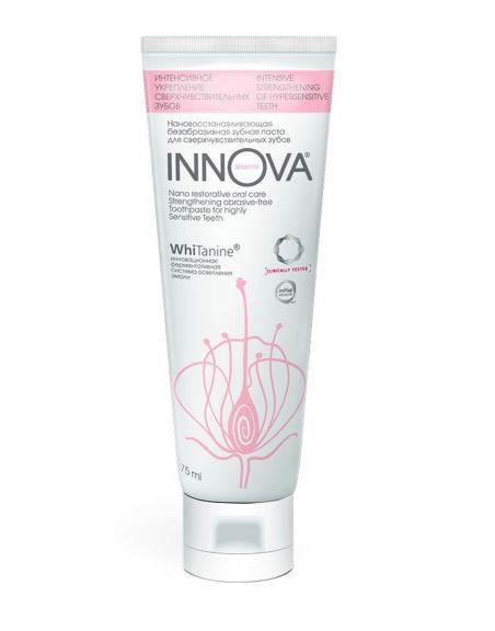 INNOVA abrasive-free toothpaste with effective Hydroxyapatite dosage (6%) in active nanoform penetrates deeply into open dentinal tubules and completely seals them, strengthens enamel and decreases hypersensitivity of teeth, including cervical area.