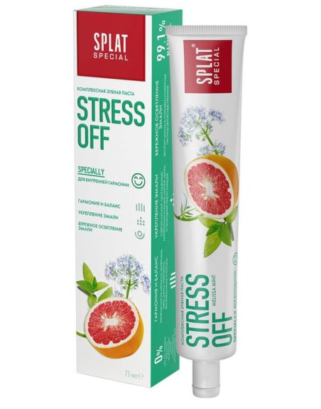 Зубная паста Specia АНТИСТРЕСС Комплексная зубная паста SPLAT STRESS OFF с мягким вкусом мелиссы и грейпфрута на 99,1% состоит из натуральных ингредиентов. Благодаря сочетанию эфирных масел мелиссы, валерианы, мяты, аниса, грейпфрута с экстрактами нима и лотоса, новая паста помогает расслабиться и настроиться на гармонию и баланс. Экстракт ананаса, полидон и округлые частицы диоксида кремния способствуют бережному осветлению зубов. Обогащенный минералами гидроксиапатит и природный лактат кальция укрепляют эмаль.