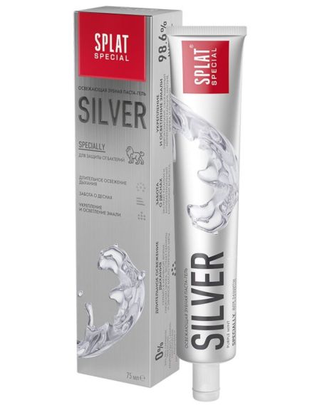 Освежающая зубная паста-гель SPLAT SILVER со вкусом насыщенной мяты создана специально для защиты от бактерий. Серебро в активной форме, экстракт периллы и эфирное масло перечной мяты надолго освежают дыхание. Экстракт ратании и антибактериальный компонент Bisabolol заботятся о деснах. Гидроксиапатит, обогащенный минералами кальция, магния, цинка, и полидон способствуют укреплению и осветлению эмали.