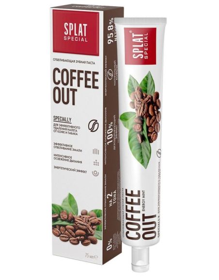 Энергетическая ОТБЕЛИВАЮЩАЯ зубная паста без фтора СПЛАТ КОФЕ АУТ идеально отбеливает эмаль, удаляет налет от кофе, чая и красного вина, инетенсивно ОСВЕЖАЕТ дыхание. Полидон эффективно расщепляет зубной налет и безопасно ОТБЕЛИВАЕТ эмаль. Натуральный кофеин ускоряет пробуждение, помогает взбодриться и избавиться от сонливости. Эфирное масло мяты, ментил тактат обладают противовоспалительным и тонизирующим эффектом. Клинически доказанная эффективность за 4 недели применения эффективное отбеливание эмали до 2 оттенков.