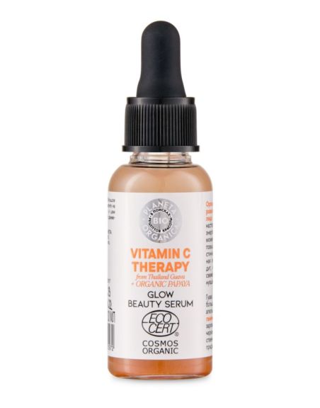 Органическая сертифицированная сыворотка для лица «сияние кожи» Настоящий природный энергетический коктейль, моментально тонизирует, повышает упругость и эластичность кожи. Наполненная энергией кожа выглядит, как никогда раньше, свежей, сияющей и отдохнувшей. Гуава содержит в 10 раз больше витамина С, чем апельсин. Витамин С из органического масла гуавы заряжает кожу энергией, подчеркивает и усиливает естественное здоровое сияние, придавая лицу ровный тон. Органический экстракт папайи содержит натуральный энзим папаин, который освобождает кожу от токсинов, обновляет и омолаживает, делая ее гладкой и бархатистой. 98,8% всех компонентов натурального происхождения 20,6% всех компонентов органического происхождения Продукт сертифицирован международной некоммерческой ассоциацией COSMOS-standard AISBL «COSMOS» (COSMetic Organic Standard) - первый европейский стандарт для натуральной и органической косметики, созданный в 2010 году ведущими организациями по сертификации натуральных и органических косметических средств в Европе: BDIH (Германия), Soil Association (Англия), ECOCERT, Cosmebio (Франция) и ICEA (Италия). Сертификация "Cosmos Organic" означает, что сертифицированный продукт: 1. Содержит не менее 95% Натуральных ингредиентов. 2. Содержит не менее: - 20% органических ингредиентов в несмываемых косметических средствах - 10% органических ингредиентов в смываемых косметических средствах 3. Используемое в продукте сырье является экологически и биологически чистым. 4. Продукт не содержит: - агрессивных моющих компонентов (напр. SLES) - продуктов нефтехимии - синтетических консервантов - синтетических отдушек - синтетических красителей - силиконов - ингредиентов, полученных путем насилия над животными 5. Продукт не тестируется на животных. 6. Упаковка, подлежит вторичной переработке либо биоразлагаемая.