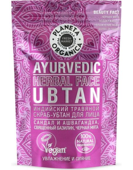 Индийский травяной скраб-убтан для лица бережно очищает, делает кожу более увлажненной и ровной, придает ей удивительное сияние. Идеально подходит для домашнего spa-ритуала. Сандал и ашвагандха - смесь самых эффективных аювердических трав для очищения лица, мягко отшелушивает и обновляет. Священный базилик чрезвычайно богат природными флавоноидами и редким витамином Р. Успокаивает и восстанавливает pH-баланс. Черная мята - природный антиоксидант, тонизирует и делает кожу гладкой и сияющей.