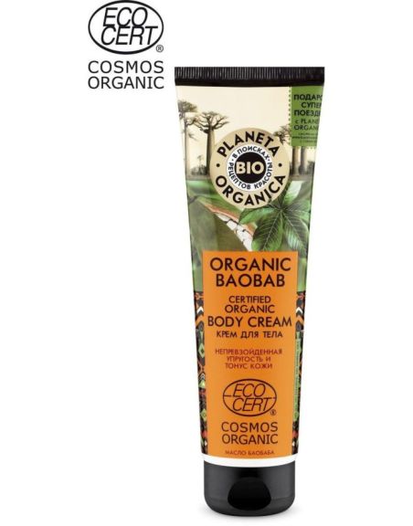 Сертифицированный органический крем для тела ORGANIC BAOBAB создан специально для упругости и тонуса кожи. Масло баобаба надежно защищает кожу от преждевременного старения и даже залечивает ожоги. Секрет в комплексе 7 жирных кислот в максимальной концентрации и витамина С, которого в баобабе содержится в 4 раза больше, чем в апельсине. Bio масло баобаба глубоко увлажняет и питает кожу, повышает ее гладкость и эластичность. Bio экстракт эфиопского кофе тонизирует и выравнивает кожу, придает ей молодость и сияние. Витамин Е - сильнейший антиоксидант, делает кожу красивой и подтянутой, сохраняя молодость. Продукт сертифицирован международной некоммерческой ассоциацией COSMOS-standard AISBL «COSMOS» (COSMetic Organic Standard) - первый европейский стандарт для натуральной и органической косметики, созданный в 2010 году ведущими организациями по сертификации натуральных и органических косметических средств в Европе: BDIH (Германия), Soil Association (Англия), ECOCERT, Cosmebio (Франция) и ICEA (Италия). Сертификация "Cosmos Organic" означает, что сертифицированный продукт: 1. Содержит не менее 95% Натуральных ингредиентов. 2. Содержит не менее: - 20% органических ингредиентов в несмываемых косметических средствах - 10% органических ингредиентов в смываемых косметических средствах 3. Используемое в продукте сырье является экологически и биологически чистым. 4. Продукт не содержит: - агрессивных моющих компонентов (напр. SLES) - продуктов нефтехимии - синтетических консервантов - синтетических отдушек - синтетических красителей - силиконов - ингредиентов, полученных путем насилия над животными 5. Продукт не тестируется на животных. 6. Упаковка, подлежит вторичной переработке либо биоразлагаемая.