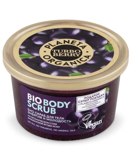 Turbo Berry от Planeta Organica - это энергия сочных органических ягод, которые восполняют потребность кожи в витаминах! Почему мы выбрали Амазонскую ягоду асаи для серии TURBO BERRY? Амазонка - река, полная энергии и мощи. Только на ее берегах растут удивительные пальмы асаи, усыпанные гроздьями ярко- фиолетовых ягод, которые называют «фонтаном молодости». Амазонские ягоды асаи содержат все известные витамины и являются чемпионами по количеству антиоксидантов. Ценные жирные кислоты, входящие в состав ягод, питают кожу, природные фитостеролы и антоцианы делают ее упругой и заряжают энергией. Био скраб для тела превосходно обновляет кожу. Органический сок ягод асаи придает упругость и эластичность. Органическое масло бразильского ореха глубоко питает кожу, делая ее гладкой и нежной. Не содержит SLS и парабенов, не содержит компонентов животного происхождения.