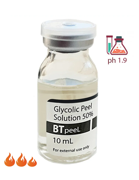 Гликолевая кислота является энхансером, разрушает межклеточные связи, обладает мощным стимулирующим воздействием на клетки дермы, нормализует клеточный метаболизм, стимулирует репаративный потенциал клеток. Пилинг с гликолевой кислотой разрыхляет роговой слой, отшелушивает клетки, стимулирует фибробласты, оказывает противовоспалительное и антисептическое действие. Показания к применению гликолевого пилинга: возрастные изменения, акне, постакне, гиперкератоз, гиперпигментация. ВАЖНО! Гликолевый пилинг BTpeel имеет очень низкий pH (=1,9), необходимо использовать НЕЙТРАЛИЗАТОР