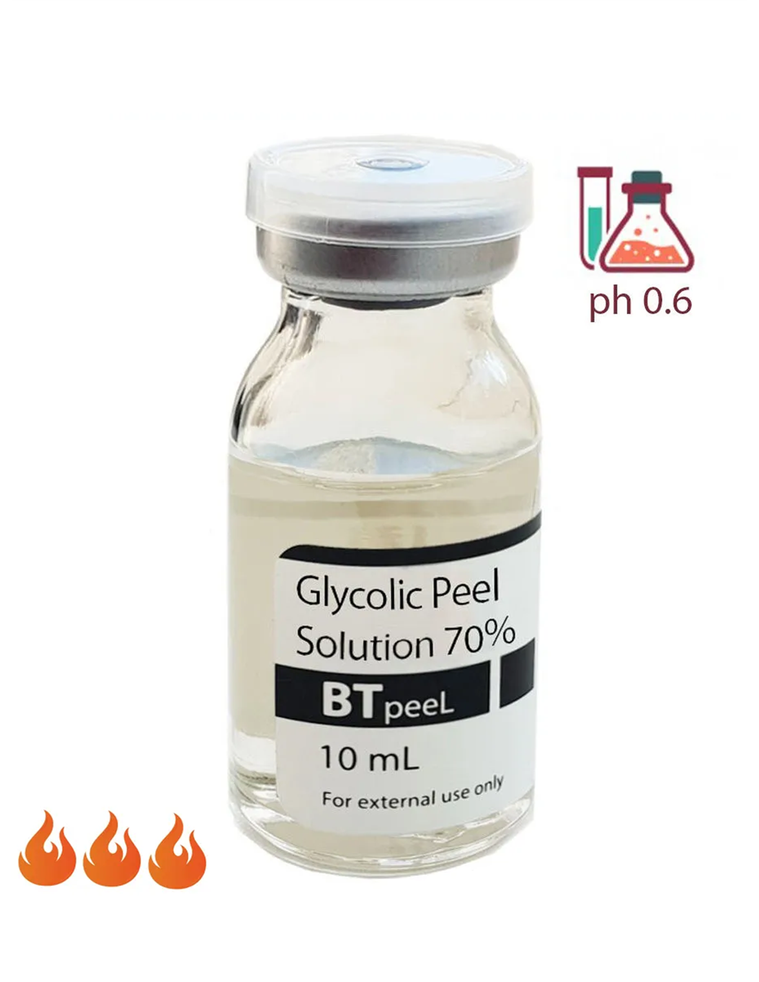 Гликолевая кислота является энхансером, разрушает межклеточные связи, обладает мощным стимулирующим воздействием на клетки дермы, нормализует клеточный метаболизм, стимулирует репаративный потенциал клеток. Пилинг с гликолевой кислотой разрыхляет роговой слой, отшелушивает клетки, стимулирует фибробласты, оказывает противовоспалительное и антисептическое действие. Показания к применению гликолевого пилинга: возрастные изменения, акне, постакне, гиперкератоз, гиперпигментация. ВАЖНО! Гликолевый пилинг BTpeel имеет очень низкий pH (=0,6), необходимо использовать НЕЙТРАЛИЗАТОР для завершения процедуры, избегать попадания в глаза!