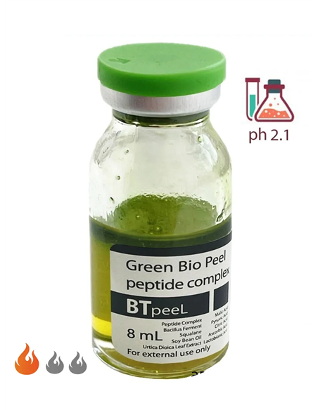 Инновационный зеленый двухфазный пилинг BTpeel с биостимулириующим, ревитализирующим и отшелушивающим действием. Благодаря кератолическому действию способствует обновлению клеток, удаляя клетки верхних слоев эпидермиса с селективным действием на соединительные связи корнеоцитов. Таргетное действие активных ингредиентов способствует глубокой стимуляции, ревитализации дермы и ускорению биосинтетических процессов, необходимых для противодействия последствий старения кожи и окислительного повреждения, вызванного УФ - излучением.