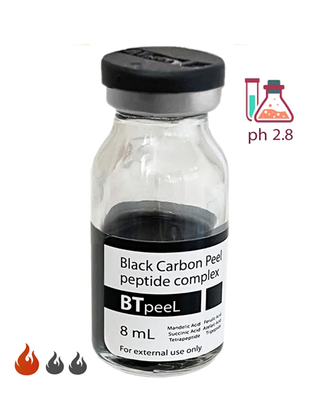 Черный пилинг BTpeel работает аккуратно, не травмирует кожу, не оставляет следов и не требует длительного восстановления. После процедуры возможна эритема, которая проходит в течение часа. Активные компоненты черного пилинга и технология нанесения дают результат, сравнимый с лазерным карбоновым пилингом, но без риска осложнений. У кислотного карбонового пилинга гораздо меньше противопоказаний к применению, нет никаких побочных эффектов и реабилитационного периода. Пилинг содержит 9% кислот (миндальную, янтарную, азелаиновую и феруловую). Пептиды в составе пилинга представляют собой белки, которые являются строительным элементом для кожи и оказывают восстанавливающее воздействие на кожу после негативного влияния окружающей среды, стрессов, загрязненного воздуха, курения. Повышает собственный потенциал защиты кожи. Пептиды стимулируют клетки молодости - фибробласты, которые имеют отношение к выработке компонентов внеклеточного матрикса кожи (коллагеновые и эластиновые волокна, гиалуроновая кислота, фибронектин, гликозаминогликаны). Пилинг содержит черный углерод (карбон), который состоит из тонко измельченных мелкодисперсных частиц древесного угля. Действует как адсорбент, притягивающий и вытягивающий все токсины и загрязнения кожи.
