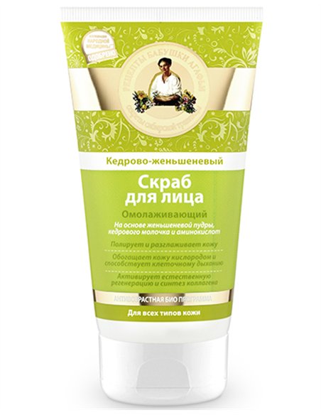 Кедрово-женьшеневый скраб для лица бережно обновляет кожу, обогащает кислородом и способствует клеточному дыханию. Женьшеневая пудра полирует и разглаживает кожу, способствует естественной регенерации и омоложению. Кедровое молочко богато антиоксидантами и витамином Е, глубоко питает, делая кожу нежной и бархатистой. Комплекс аминокислот способствует синтезу коллагена, придает коже тонус и упругость.