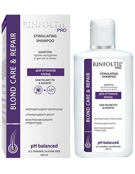 Оттеночный шампунь для волос женский профессиональный РИНФОЛТИЛ PRO разработан для окрашенных в оттенки блонд, мелированных и седых волос. Мягкая формула обеспечивает бережный уход за волосами. Фиолетовый пигмент предотвращает появление желтизны волос. Шампунь РИНФОЛТИЛ PRO рекомендуется против выпадения и для активации естественного роста волос. Лечебный трихологический шампунь от выпадения волос РИНФОЛТИЛ PRO не раздражает чувствительную кожу головы. Экстракт карликовой пальмы блокирует выработку дигидротестостерона, предотвращает выпадение и истончение волос, стимулирует рост новых волос.