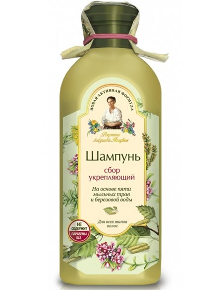 Березовая вода, входящая в состав шампуня, является эффективным средством, укрепляющим корни волос, а бережно собранные сибирские травы устраняют ломкость, укрепляя волосы по всей длине. Натуральная вспенивающая основа на пяти мыльных травах (солодка уральская, амарант, качим сибирский, белый и красный мыльные корни) мягко очищает волосы и кожу головы.