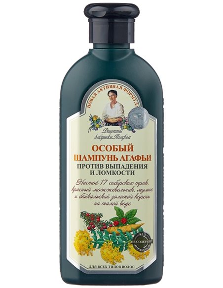 Особый шампунь Агафьи против выпадения и ломкости создан на настое 17 сибирских трав, красного можжевельника и байкальского золотого корня на талой воде, с добавлением мумие. С давних пор в мудрой народной практике использовалась талая вода: приносили в избу полное корыто снега или льда и ждали, когда он растает… а после использовали для оздоровления. Содержание в шампуне талой воды обеспечивает очень мягкую основу для мытья, а в сочетании с удивительными по своим природным свойствам компонентами - горным бальзамом (мумие), байкальским золотым коренем и красным можжевельником - спасет волосы от выпадения, придаст им прочность и обеспечит здоровый рост.