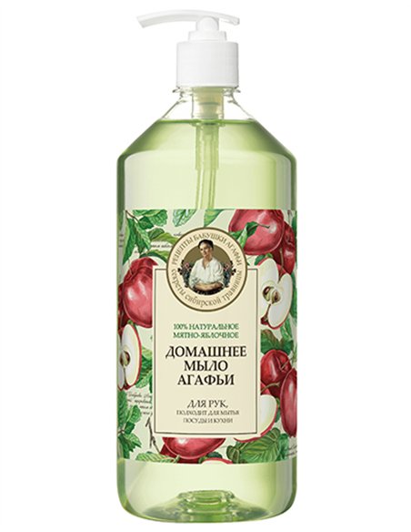 Мятно-яблочное мыло Агафьи - это новый продукт в линейке уже полюбившегося домашнего мыла, теперь с доказанными антибактериальными свойствами. Домашнее мыло прекрасно подходит для мытья рук и посуды, справляется с уборкой на кухне и убивает 99% бактерий. Мыльный корень - натуральная пенящаяся основа, богатая сапонинами, эффективно очищающая, но при этом абсолютно безопасная и гораздо мягче щелочи, используемой в обычном мыле. Яблочные кислоты очищают загрязнения любой природы и растворяют жир. Эфирное масло лимонника и мятное масло обладают антисептическими и бактерицидными свойствами, придает посуде и кухонным поверхностям свежесть. Экстракт мелиссы насыщает кожу витаминами, придает ей мягкость и нежность.