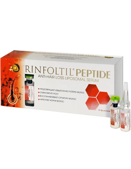 Липосомальная сыворотка для волос РИНФОЛТИЛ ПЕПТИД – мощный активатор роста волос, содержит медный пептид (трипептид меди, GHK-Cu), экстракт карликовой пальмы сереноа, биотин, ниацин, витамин С и аминокислоты (аргинин, таурин), рекомендуется от выпадения волос у женщин и мужчин.
