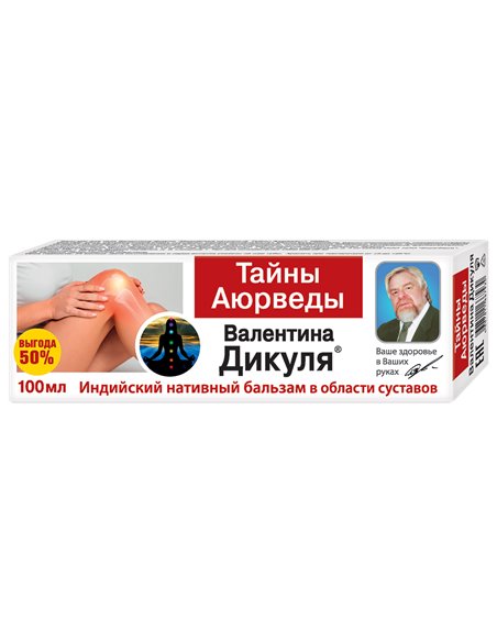 Тайны Аюрведы. Индийский нативный бальзам для тела Валентина Дикуля - эффективное средство для местного применения, разработанное специалистом по болезням опорно - двигательного аппарата академиком Валентином Ивановичем Дикулем, по просьбам пациентов, после тщательного подбора компонентов, действие которых направлено на активизацию кровообращения и метаболизма в проблемной области, расслабление мышц, а также стимуляцию локального иммунитета. Коммифора оказывает многостороннее влияние на организм человека. Это омолаживающее, стимулирующее обменные процессы, обезболивающее и антисептическое средство. Аюрведа настоятельно рекомендует включать коммифору в рецепты при лечении всех основных заболеваний суставов и опорно-двигательного аппарата. Мумие(Asphaltum) - один из самых мощных биостимуляторов, активизирует репаративные процессы, ускоряет восстановление костных и хрящевых тканей, замедляет процессы старения сустава, способствует уменьшению ломоты, возникающей при переменах погоды. В несколько раз усиливает лечебные свойства лекарственных растений. Капсаицин (Capsaicinum, вещество, получаемое из жгучего перца) -оказывает сильное разогревающее и местное обезболивающее действие, активизирует обменные процессы в мышечной и около суставной ткани, улучшает микроциркуляцию. Снижает отечность, снимает мышечный спазм, является проводником для других лечебных компонентов. Блокирует действие химических медиаторов (субстанции П),провоцирующих воспаление и передающих болевые импульсы в ЦНС. Куркума - возможно одна из лучших специй на планете в борьбе со многими болезнями и в их профилактике. Список ее полезных свойств кажется бесконечным и, кажется, уже все люди, контролирующие свой образ жизни, обратили на неё своё внимание. Это поставило ее на первое место в топе самых полезных специй и растений, оставив позади себя корицу, чеснок, имбирь и семена расторопши. Одним из наиболее удивительных явлений этой специи оказалось, в ходе проведенного исследования, ее способность не уступать по полезности определенным фармацевтическим препаратам. Вообще результаты многих исследований демонстрируют, что использование куркумы, может принести больше пользы, чем многие лекарства:- противовоспалительные;- обезболивающие;- снижающие уровень холестерина;- стероиды. Имбирь (Zingiber) - его корень оказывает противовоспалительное, обезболивающее, рассасывающее, заживляющее и тонизирующее действие. Содержит практически полный состав аминокислот, необходимых человеческому организму, а также витамины А, С, группы В, эфирные масла, комплекс микроэлементов. Гвоздика - меняет акценты жизненной установки от произведения внешних эффектов к личностном усовершенствованию. Укрепляет и утолщает ауру. Сообщает организму стоические свойства, помогающие быстрому восстановлению после травм, болезней и операций. Эвкалипт - масло-спаситель, придает силы, помогает быстро восстановиться после стресса и болезни. Увеличивает количество энергии, ответственной за здоровье и долголетие. Комплекс экстрактов лекарственных растений, составленный по принципу синергизма, способствует уменьшению воспалительных явлений, активизирует репаративные процессы в тканях, обладает антиоксидантным, обезболивающими миорелаксирующим (расслабляющим мышцы) действием.