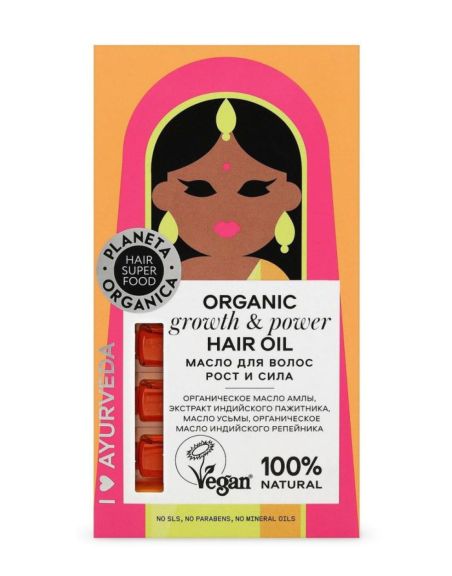 Органическое масло амлы — уникальный суперфуд для волос, в нем содержатся витамины А, В, РР и флавоноиды, которые стимулируют рост и препятствуют выпадению волос. Масло усьмы является суперэффективным средством, содержит олеиновую кислоту, которая действует как проводник для полезных компонентов, помогает проникнуть в структуру волос и укрепить их по всей длине. Экстракт индийского пажитника, который еще называют «Львиная грива», ценят за высокое содержание лецитина, обеспечивает густоту и рост сильных волос. Органическое масло индийского репейника - самый известный суперфуд для красивых волос, содержит рекордное количество природных аминокислот и минеральных веществ, укрепляет и активирует волосяные луковицы, стимулируя быстрый рост волос. Удивительно длинные и густые волосы индийских женщин поражают всех, их секрет - мощные аюрведические компоненты для ухода за волосами.