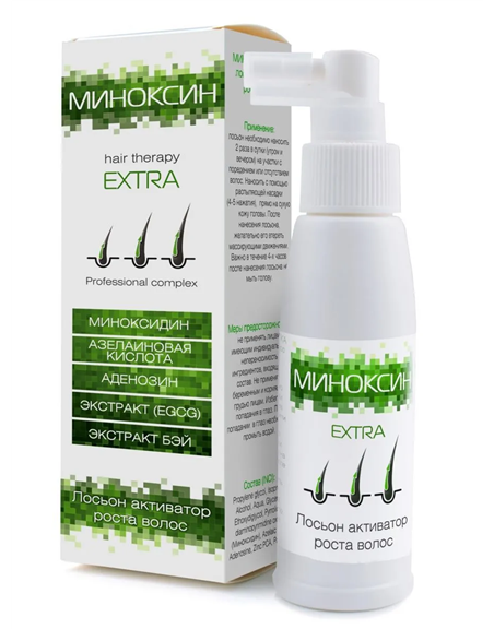 Лосьон с компонентами нового поколения специально разработан для активации роста волос. Компоненты лосьона помогают корням волос оставаться активными и сохранить нормальный рост волос в течение всей жизни. Рекомендуется как для женщин, так и для мужчин. Миноксидин и азелаиновая кислота модулируют воздействие андрогенов на волосяные мешочки. Опосредованно угнетают превращение тестостерона в дигидротестостерон. Аденозин, кофеин, экстракт репейника, экстракт EGCG, экстракт Бэй, витамин Е и другие компоненты усиливают действие лосьона. Лосьон необходимо наносить 1 раз в сутки на участки с поредением или отсутствием волос с помощью распыляющей насадки (20 нажатий), прямо на сухую кожу головы. После нанесения лосьона, желательно его втереть массирующими движениями. Важно в течение 4-х часов после нанесения лосьона не мыть голову. Устойчивый результат через 2-3 месяца применения. Лосьон оказывает охлаждающе-разогревающий эффект и кратковременное покраснение кожи. Не содержит сульфатов, парабенов, силиконов, минеральных масел, синтетических красителей и консервантов.