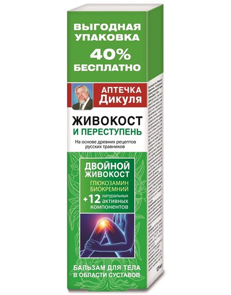 Состав: Вода, спирт цетеариловый, цетеарет-20, масло подсолнечное, пропиленгликоль, глицерин, цетилфосфат калия, глицерил стеарат, масло вазелиновое, изогексадекан, диметикон, капсаицин, пропиленгликолевый экстракт окопника (живокоста), масляные экстракты адамова корня (брионии/переступня), сабельника, шиповника, лопуха, шлемника, золотого уса, хондроитин сульфат, глюкозамина сульфат, масло эфирное чайного дерева, Д-пантенол, муравьиный спирт, мумие, метилникотинат, экстракт хвоща, тетрабутилгидрохинон, лимонная кислота, парфюмерная композиция, феноксиэтанол, этилгексилглицерин, краситель колер сахарный, цитронеллол, лимонен, гераниол, гексил циннамал, бутилфенил метилпропионал, линалоол, гидроксиизогексил 3-циклогексен карбоксальдегид.
