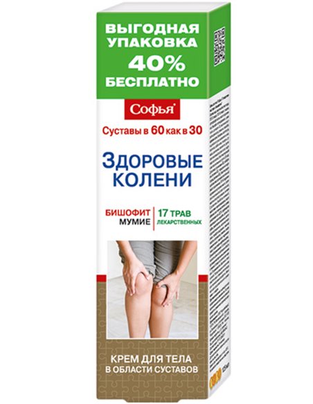 СОФЬЯ -17 лекарственных трав с бишофитом - специальный крем для тела в области коленей. Область применения:- при повышенных нагрузках наколенные суставы;-для профилактики при наличии факторов риска;- при малоподвижном образе жизни;- для профилактики сезонных обострений. Эффективность крема СОФЬЯ-17 лекарственных трав с бишофитом обеспечена высокой биологической активностью и синергизмом его натуральных компонентов, оказывающих глубокое комплексное действие в области коленей. Действие компонентов. Бишофит (Bishofit) – природный поли минерал, в состав которого входят около 70 элементов. Широко применяется в медицине при заболеваниях суставов, оказывает выраженное противовоспалительное, болеутоляющее и регенерирующее действие, активизирует обменные процессы. Широко применяется в санаторном лечении заболеваний опорно-двигательного и нервно-мышечного аппарата. Адамов корень (Tamus communis),Индийский лук (Ornithogalumcaudatum), Перец красный острый (чили, Capsicum frutescens),Сумах ядовитый (Rhus toxico-dendron) оказывают выраженное разогревающее и обезболивающее действие. Обладают высокой проникающей способностью. Вызывают местный прилив крови, активизируют обменные процессы в околосуставных тканях и улучшают питание суставов, снижают болевую чувствительность, ускоряют выведение солевых отложений. Окопник (живокост, Symphytum),Сабельник болотный (Сотагитpalustre), Босвелия (Boswellia) -лекарственные растения с подтвержденным регенерирующим, противовоспалительным, антибактериальным, обезболивающим, солевыводящим, противоревматическим и биостимулирующим действием. Активизируют процессы обновления клеток костной и хрящевой ткани. Золотой ус (Callisia Fragronce),Алоэ вера (Aloe Vera) - мощные биогенные стимуляторы с широким спектром лечебного действия. Ускоряют обновление и самовосстановление клеток хрящевых тканей. Облепиха (Hippophae), Шиповник(Rosa cinnamomea) замедляют возрастные изменения суставов, повышают их устойчивость к нагрузкам и сопротивляемость инфекции, препятствуют воспалительным процессам. Девясил (Inula helenium L.),Ромашка аптечная (Matricariachamomilla), Зверобой (Hypericum)оказывают противовоспалительное, болеутоляющее действие, улучшают трофику и регенерацию тканей суставов. Мумиё (Asphaltum) - сложное по химической структуре природное образование, добываемое в горах, уникальный природный биостимулятор. Более 3 тысяч лет -широко используется в медицине в качестве средства, усиливающего регенеративные процессы в тканях организма, а также обладающего противовоспалительным, против отёчным, иммуностимулирующим действием. Преимущества крема СОФЬЯ -17 лекарственных трав с бишофитом. Оказывает глубокое направленное воздействие, не имеет побочных эффектов. Может применяться длительное время, при этом эффективность повышается. Не вызывает привыкания.