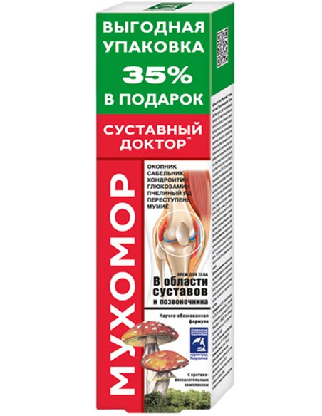 Состав: вода, спирт цетеариловый, цетеарет-20, масло подсолнечное, пропиленгликоль, глицерин, цетилфосфат калия, глицерил стеарат, масло вазелиновое, изогексадекан, диметикон, капсаицин, пропиленгликолевый экстракт мухомора, окопника (живокоста), масляный экстракт сабельника, водный экстракт брионии, биостимулирующий комплекс противовоспалительный (масло подсолнечное, ПЭГ-40 гидрогенизированное касторовое масло, пропиленгликолевый экстракт прополиса, масляный экстракт ромашки, витамин Е, аллантоин, бисаболол, витамин А, масло семян черной смородины), хондроитин сульфат, глюкозамина сульфат, мумие, Д-пантенол, яд пчелиный сырец, метилникотинат, ароматизатор пищевой, феноксиэтанол, этилгексилглицерин, третбутилгидрохинон, лимонная кислота.