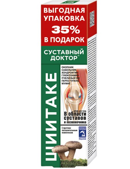 Состав: вода, спирт цетеариловый, цетеарет-20, масло подсолнечное, пропиленгликоль, глицерин, цетилфосфат калия, глицерил стеарат, масло вазелиновое, изогексадекан, диметикон, капсаицин, пропиленгликолевый экстракт окопника (живокоста), масляный экстракт сабельника, водный экстракт брионии, экстракт гриба Шиитаке, биостимулирующий комплекс противовоспалительный (масло подсолнечное, ПЭГ-40 гидрогенизированное касторовое масло, пропиленгликолевый экстракт прополиса, масляный экстракт ромашки, витамин Е, аллантоин, бисаболол, витамин А, масло семян черной смородины), хондроитин сульфат, глюкозамина сульфат, мумие, Д-пантенол, яд пчелиный сырец, метилникотинат, ароматизатор пищевой, феноксиэтанол, этилгексилглицерин, тетрабутилгидрохинон, лимонная кислота
