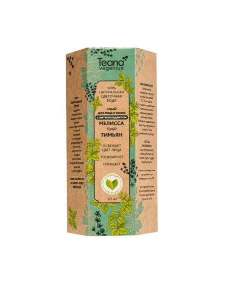 100% натуральная вода МЕЛИССА-ТИМЬЯН тонизирует кожу, улучшает цвет лица, обеспечивает защитный и детокс-эффект. Обладает бодрящим цитрусово-пряным ароматом.