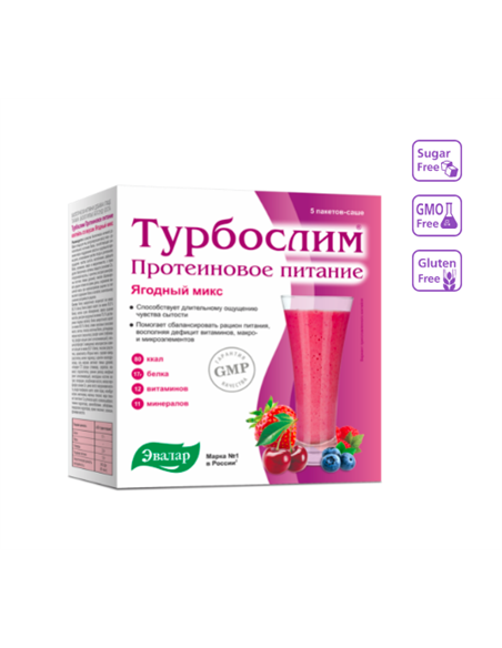 ТУРБОСЛИМ ПРОТЕИНОВОЕ ПИТАНИЕ КОКТЕЙЛЬ СО ВКУСОМ ЯГОДНЫЙ МИКС - специально для тех, кто стремится к снижению веса, а также к соблюдению правильных принципов сбалансированного питания, компания «Эвалар» разработала богатейший по своему составу комплекс «Турбослим Протеиновое питание» - высокобелковый диетический коктейль.