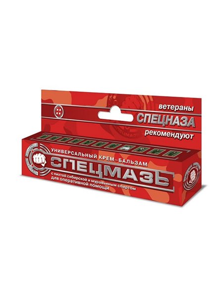 СПЕЦМАЗЬ — Универсальный крем-бальзам для оперативной помощи при различных повреждениях кожи с пихтой сибирской и муравьиным спиртом Способствует заживлению небольших ран, порезов, ожогов, ссадин, царапин, потертостей, трещин на ступнях.