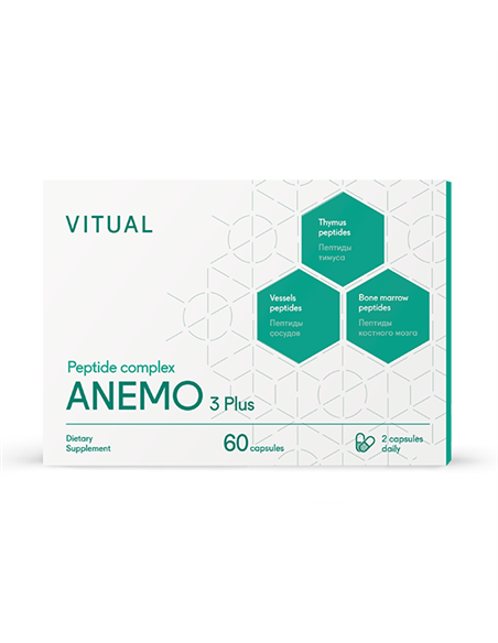 Состав: 10 мг - Пептидный комплекс А-3 (пептиды сосудов); 10 мг - Пептидный комплекс А-6 (пептиды тимуса); 10 мг - Пептидный комплекс А-20 (пептиды костного мозга). Микрокристаллическая целлюлоза (Е460, антислеживающий агент); желатин (средство для капсулирования); лактоза (наполнитель влагоудерживающий); кальция стеарат (Е470, эмульгатор).