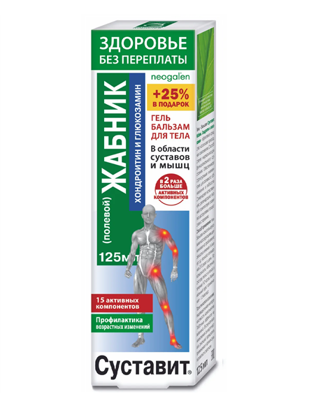 Способствует нормализации функционального состояния. Обеспечивает структурными элементами для активного обновления и гибкости. Стимулирует естественную регенерацию тканей, препятствует развитию деструктивных процессов и старению. Действие и эффективность гелябальзама для тела обеспечены высокой биологической активностью его натуральных компонентов, обладающих выраженным положительным комплексным действием. Жабник полевой многолетнее растение. При заболеваниях суставов активизирует минеральный (кальциевофосфорный) обмен, оказывает противомикробное, противовоспалительное, жаропонижающее и успокаивающее действие. Повышает проницаемость тканей, способствуя глубокому проникновению лечебных компонентов. Хондроитин сульфат – основной структурный компонент хряща и естественный защитник (хондропротектор) его клеток. Вырабатывается хрящевой тканью суставов. Повышает влагоемкость хряща, предотвращает его высыхание. Обеспечивает механические и эластические свойства суставных поверхностей, улучшает качество суставной смазки (синовиальной жидкости). Глюкозамина гидрохлорид – неотъемлемый элемент хрящевой ткани. Обеспечивает выработку хондроитина, улучшает обменные процессы в суставах. Стимулирует производство глюкозаминоглюканов, необходимых для восстановления хряща. Способствует регенерации поврежденного хряща при воспалительных и деструктивных процессах. Снижает болевые ощущения.