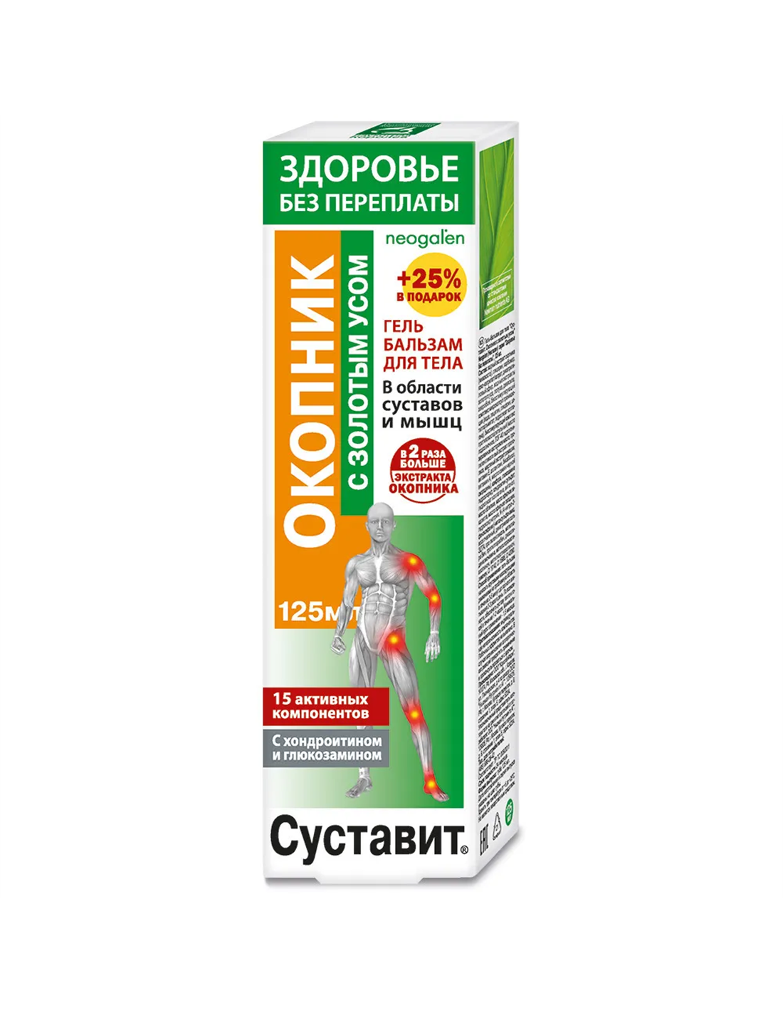 Эффективное средство на основе природных компонентов. Способствует нормализации функционального состояния. Обеспечивает структурными элементами для активного обновления и гибкости. Стимулирует естественную регенерацию тканей, препятствует развитию деструктивных процессов и старению. Действие и эффективность геля бальзама обеспечены высокой биологической активностью его натуральных компонентов, обладающих выраженным положительным комплексным действием. Окопник (живокост, Symphytum) применяется в лечебной практике около2 тысяч лет. О свойствах окопника говорит его родовое название: Symphytum от греческого “symphytos” сращивать, соединять, и Consolida от латинского “consolidare” скреплять. Стимулирует регенерацию костной и хрящевой ткани, улучшает качество синовиальной жидкости, заживляет суставные микротравмы, ускоряет сращивание костей при переломах. Аллантоин, главное действующее вещество окопника, включён в список препаратов ВОЗ. Золотой ус (Callisia Fragronce) одно из самых сильных лекарственных растений, мощный биогенный стимулятор с широким спектром лечебного действия. В листьях и усах обнаружены дубильные вещества, флавоноиды, кислоты, большое содержание кальция и других микро и макроэлементов. Используется при множестве заболеваний; особенно эффективен в качестве профилактического средства и в комплексном лечении болезней суставов и позвоночника. Обладает выраженным обезболивающим, противовоспалительным, противомикробным, антисептическим, иммуно регулирующим, восстанавливающим действием, благотворно влияет на систему кровообращения. Высокая эффективность растения принесла ему заслуженную любовь и доверие народа. Хондроитин (Chondroitin) основной структурный компонент хряща и естественный защитник (хондропротектор)его клеток. Вырабатывается хрящевой тканью суставов. Повышает влагоемкость хряща, предотвращает его высыхание. Обеспечивает механические и эластические свойства суставных поверхностей, улучшает качество суставной смазки (синовиальной жидкости).Глюкозамин (Glucosamin) неотъемлемый элемент хрящевой ткани. Обеспечивает выработку хондроитина, улучшает обменные процессы в суставах. Стимулирует производство глюкозаминоглюканов, необходимых для восстановления хряща. Способствует регенерации поврежденного хряща при воспалительных и деструктивных процессах. Снижает болевые ощущения. Коллаген (Collagen) фибриллярный белок, составляющий основу соединительной ткани организма обеспечивающий ее прочность и эластичность. Способствует быстрому восстановлению и укреплению тканей. Нарушение синтеза коллагена приводит к повреждению связочного аппарата и хрящей. Лопух, эвкалипт, девясил, зверобой обладают выраженным болеутоляющим, противовоспалительным, против отёчным и антисептическим действием. Стимулируют обмен веществ и регенерацию суставных тканей. Гвоздичное дерево (Caryophyllus агоmaticus) вечнозеленое тропическое растение из семейства миртовых. Эфирное масло получают из бутонов методом водно-паровой дистилляции. Обладает противовоспалительными и обезболивающими свойствами. Основной компонент эвгенол оказывает выраженное антисептическое действие.