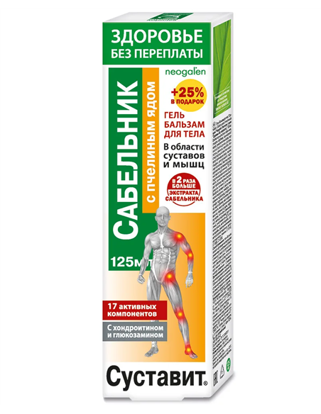 Состав: ЭВ Сабельника (Корень) 1%-ый, Глицерин, Микрокар DMP, Цетиол С5 / Cetiol С5, Цетиол OE / Сetiol OE, Изигель DO / Карбопол Ультрез-10, Гидроксид натрия, Микрокар IT (Катон CG), Трилон Б (ЭДТА), Яд пчелиный сырец, Масло эфирное эвкалипта, Глюкозамин гидрохлорид, Хондроитин сульфат (Бычий), Гидролизат коллагена, ЭВ Арники, ЭВ Крапивы, ЭВ Лопуха, ЭВ Девясила, ЭВ Зверобоя, Нимесулид, Воск пчелиный, Биостимулирующий комплекс "Микрокапсул проникающих", Биостимулирующий комплекс "Противовоспалительный", Витанол, Масло облепихи, Масло эфирное можжевельника, Камфора.