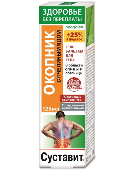 Способствует нормализации функционального состояния. Обеспечивает структурными элементами для активного обновления и гибкости. Стимулирует естественную регенерацию тканей, препятствует развитию деструктивных процессов и старению. Окопник (живокост) известен в медицине около 2 тысяч лет. Способствует восстановлению поврежденных тканей, особенно костных, отсюда и родовое название растения Symphytum officinale (греч.) – сращивать, соединять. Стимулирует регенерацию костной и хрящевой ткани при заболеваниях суставов, улучшает качество синовиальной жидкости, заживляет суставные микротравмы, ускоряет сращивание костей при переломах. Пчелиный яд – продукт секреторной деятельности ядовитых желез медоносных пчёл, высокоэффективное натуральное средство лечения широкого круга заболеваний. Особенно высокие результаты (до 98%) достигаются при лечении заболеваний суставов и позвоночника. Обладает выраженным противовоспалительным, разогревающим, обезболивающим, бактерицидным, иммунокорректирующим действием, активизирует кровоток, улучшает обмен веществ в суставе и питание суставных тканей. Повышая проницаемость кожных покровов, способствует глубокому проникновению лечебных компонентов в проблемную область. Действие и эффективность гель-бальзама для тела обеспечены высокой биологической активностью его натуральных компонентов, обладающих выраженным положительным комплексным действием.