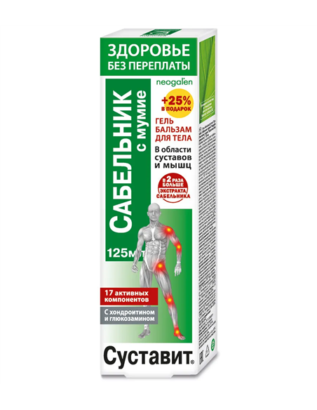 Способствует нормализации функционального состояния. Обеспечивает структурными элементами для активного обновления и гибкости. Стимулирует естественную регенерацию тканей, препятствует развитию деструктивных процессов и старению. Действие и эффективность геля бальзама обеспечены высокой биологической активностью его натуральных компонентов, обладающих выраженным положительным комплексным действием. Сабельник болотный лекарственное растение с выраженным биостимулирующим, антибактериальным, обезболивающим, противовоспалительным, солевыводящим, противоревматическим и регенерирующим действием. Обладает многочисленными лечебными свойствами. Содержит микроэлементы (фосфор, калий, магний, медь), дубильные вещества, флавоноиды, эфирные масла, органические кислоты, каротин. Признанное народное средство для борьбы с ревматизмом, радикулитом, артритами и артрозами, отложением солей в суставах рук и ног. Снимает отечность , повышает подвижность суставов и позвоночника. Мумие (Asphaltum) один из самых мощных биостимуляторов, активизирует репаративные процессы, ускоряет восстановление костных и хрящевых тканей, замедляет процессы старения сустава, способствует уменьшению ломоты, возникающей при переменах погоды. В несколько раз усиливает лечебные свойства лекарственных растений. Лопух обладает широким спектром лечебного действия: антисептическим, антимикробным, солевыводящим, противовоспалительным, против отёчным, ранозаживляющим. Наружно применяется при подагре, ревматизме, обострении суставных заболеваний при переохлаждении, а также при травмах конечностей, ожогах и ранах. Стимулирует обмен веществ и регенерацию тканей. Девясил в традиционной медицине считается растением, лечащим от девяти недугов. При заболеваниях суставов оказывает антисептическое, противовоспалительное, болеутоляющее, тонизирующее, заживляющее действие, улучшает обмен веществ в тканях. Зверобой воздействует как местное анестезирующее, противовоспалительное, антисептическое средство. Снимает мышечные спазмы, улучшает питание суставов, трофику тканей, ускоряет регенерацию хряща. Помогает при травмах, ушибах, ожогах, ранах, болях ревматического характера. Оказывает также ранозаживляющее и бактерицидное действие. Содержит множество микроэлементов, флавоновые гликозиды, рутин, кверцитрин, каротин. Камфора средство растительного происхождения, добывается из листьев и древесины камфорного дерева Ciamomum camphora, произрастающего в Индии и Китае. При наружном применении в области суставов оказывает антисептическое, согревающее, анальгезирующее и противовоспалительное действие, расширяет кровеносные сосуды и улучшает трофику около суставных тканей. Глюкозамин и коллаген строительные материалы для естественного восстановления тканей опорно-двигательного аппарата. Обеспечивают питание и жизнеспособность хондроцитов, способствуют регенерации и укреплению хрящей, связок, повышают их прочность и упругость, улучшают подвижность суставов и позвоночника. Эфирные масла лекарственных растений оказывают антисептическое, регенерирующее, болеутоляющее, спазмолитическое, противовоспалительное, против отёчное действие. Широко применяются в медицине при лечении ревматизма, артрита,