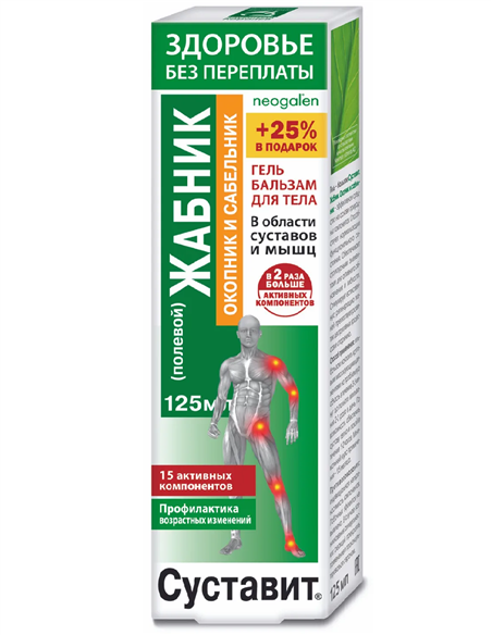 эффективное средство на основе природных компонентов.Окоп Способствует нормализации функционального состояния. Обеспечивает структурными элементами для активного обновления и гибкости. Стимулирует естественную регенерацию тканей, препятствует развитию деструктивных процессов и старению. Действие и эффективность геля-бальзама для тела обеспечены высокой биологической активностью его натуральных компонентов, обладающих выраженным положительным комплексным действием. Жабник полевой многолетнее растение. При заболеваниях суставов активизирует минеральный (кальциево-фосфорный) обмен, оказывает противомикробное, противовоспалительное, жаропонижающее и успокаивающее действие. Повышает проницаемость тканей, способствуя глубокому проникновению лечебных компонентов. Окопник (Живокост) благодаря рекордному количеству аллантоина, эффективно восстанавливает поврежденные ткани, отсюда и родовое название растения Symphytum officinale (греч.) – сращивать, соединять. Стимулирует регенерацию костей и хряща, улучшает качество синовиальной жидкости, заживляет суставные микротравмы. Сабельник болотный (Comarum palustre) обладает многочисленными лечебными свойствами. При воздействии на суставы оказывает биостимулирующее, антибактериальное, обезболивающее, противовоспалительное действие, способствует выведению солевых отложений, стимулирует восстановление хрящевой ткани.