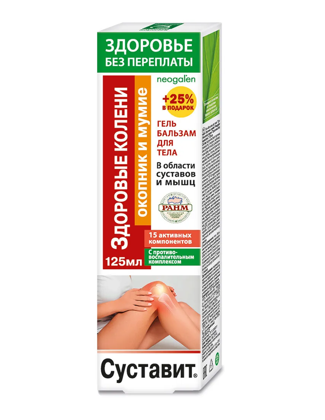 Состав: ЭВ Окопника (Корень), Глицерин, Микрокар DMP, Изигель DO, Цетиол С5, Цетиол OE, Гидроксид натрия, Мумие, Пропиленгликоль, Катон CG, Трилон Б, Масло эфирное эвкалипта, Глюкозамин гидрохлорид, Хондроитин сульфат (Бычий), Гидролизат коллагена, ЭВ Арники, ЭВ Крапивы, ЭВ Лопуха, ЭВ Девясила, ЭВ Зверобоя, Нимесулид, Воск пчелиный желтый, Биостимулирующий комплекс "Микрокапсул проникающих", Биостимулирующий комплекс "Противовоспалительный", Витанол, Масло облепихи, Масло эфирное можжевельника, Камфора.