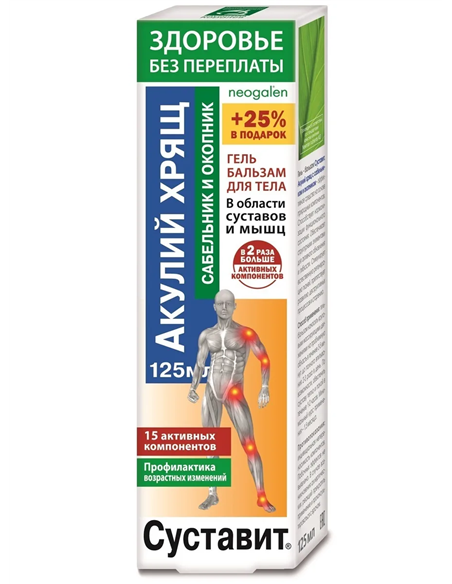 Эффективное средство на основе природных компонентов. Способствует нормализации функционального состояния. Обеспечивает структурными элементами для активного обновления и гибкости. Стимулирует естественную регенерацию тканей, препятствует развитию деструктивных процессов и старению.Акулий хрящ – это хрящевая ткань основы скелета акулы. Ещё 40 лет назад американские ученые во главе с Уильямом Леином доказали выраженную способность восстанавливать хрящевую и костную ткань. При этом акулий хрящ способствует улучшению метаболизма и структуры хрящевой ткани и состояния сосудов. Происходит это за счет высокого содержания глюкозамина, который является основным веществом для образования гликозаминогликанов, которые непосредственно участвуют в формировании хряща. Также он удерживает воду и растворенные в ней элементы внутри хрящей и связочного аппарата, препятствуя его высыханию, что положительно влияет на состояние суставов. В хряще акулы в огромном количестве содержится низкомолекулярный хондроитин, который помогает вырабатываться синовиальной жидкости, улучшает питание и регенерацию хрящевой ткани. Такая необходимость возникает при метаболических нарушениях, которые сопровождаются возрастным ухудшением процесса питания хрящевой ткани или при чрезмерных нагрузках на опорно-двигательный аппарат.Сабельник болотный (Comarum palustre) – лекарственное растение с выраженным биостимулирующим, противовоспалительным, антибактериальным, обезболивающим, солевыводящим, противоревматическим и регенерирующим действием. Обладает многочисленными лечебными свойствами. Признанное народное средство для борьбы с ревматизмом, радикулитом, артритами и артрозами, отложением солей в суставах рук и ног. Способствует снятию воспаления, отечности, оказывает положительное влияние при нарушениях подвижности суставов и позвоночника.Окопник (живокост, Sýmphytum) – одно из самых популярных в народной медицине лекарственных растений, применяется в лечебной практике около 2 тысяч лет. Стимулирует регенерацию костной и хрящевой ткани при заболеваниях суставов, улучшает качество синовиальной жидкости, заживляет суставные микротравмы, ускоряет сращивание костей при переломах. Корни содержат большое количество биоактивных веществ. Аллантоин, главное действующее вещество окопника, включён в список местных анестетиков, вяжущих и противовоспалительных препаратов Всемирной Организации Здравоохранения.Действие и эффективность геля-бальзама для тела обеспечены высокой биологической активностью его натуральных компонентов, обладающих выраженным положительным комплексным действием.